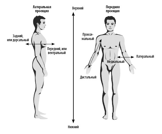 Под анатомическим, или стандартным, расположением понимают такое положение тела, при котором человек стоит прямо, лицо обращено вперед, руки опущены, предплечья супинированы (пальцы выпрямлены, ладони открыты и обращены вперед, большой палец каждой руки смотрит вбок). Если ладонь обращена назад, а большой палец смотрит в сторону тела, то такое положение предплечья называется пронированным. Все описания топографического расположения структур в организме приведены по отношению к стандартному положению. Это контрольная точка, помогающая медицинским специалистам лучше ориентироваться в нашем теле.