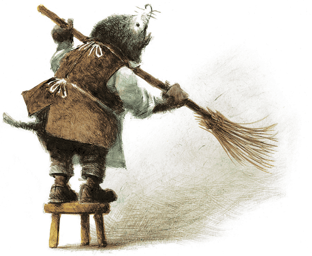 Всё утро Крот усердно трудился: пришла пора весенней приборки. Шваброй и щёткой, метлой и мокрыми тряпками – полы и лестницу, мебель и коврик… В горле у него першило от пыли, мыльная пена забрызгала чёрный мех, спину и ноги ломило от усталости.