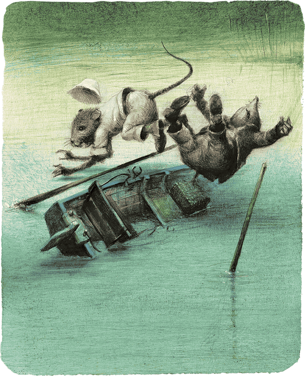 Крот резко дёрнул, глубоко зарыл лопасти в воду и – потерял равновесие. Пятки его взлетели выше головы, и он очутился верхом на совсем ошеломлённом Крысе. Растерявшись, Крот уцепился за борт, и в следующий миг громкий всплеск возвестил правоту Крыса: лодка перевернулась, и Крот бултыхнулся в воду.
