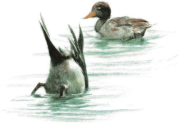 Кря-кря-крячут уткиТам, где камыши…Снизу вверх, снизу вверхХвост дер-жи!Селезни да утки –Сколько жёлтых лап!Ну-ка, клювы жёлтые,Рыбку – ап!Водоросли сочные,Плавает плотва –От такой кладовкиКругом голова!Каждый всё, что нравится,Сделает на бис –Хвостиком наружу,Головою вниз!Где-то в небе синемКружатся стрижи…Снизу вверх, снизу вверхХвост дер-жи!