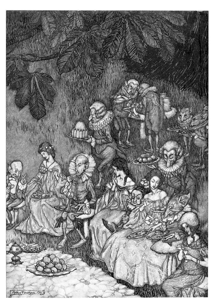 Скатерть на столе бывает разная – в зависимости от времени года, когда устраивается бал: в мае, например, она делается из цветов каштана. Десятки слуг-эльфов взбираются на каштаны и трясут ветки, отчего цветы, точно снег, падают вниз. Потом другие слуги сметают их вместе, пока они не становятся похожи на скатерть, – так и получается скатерть.