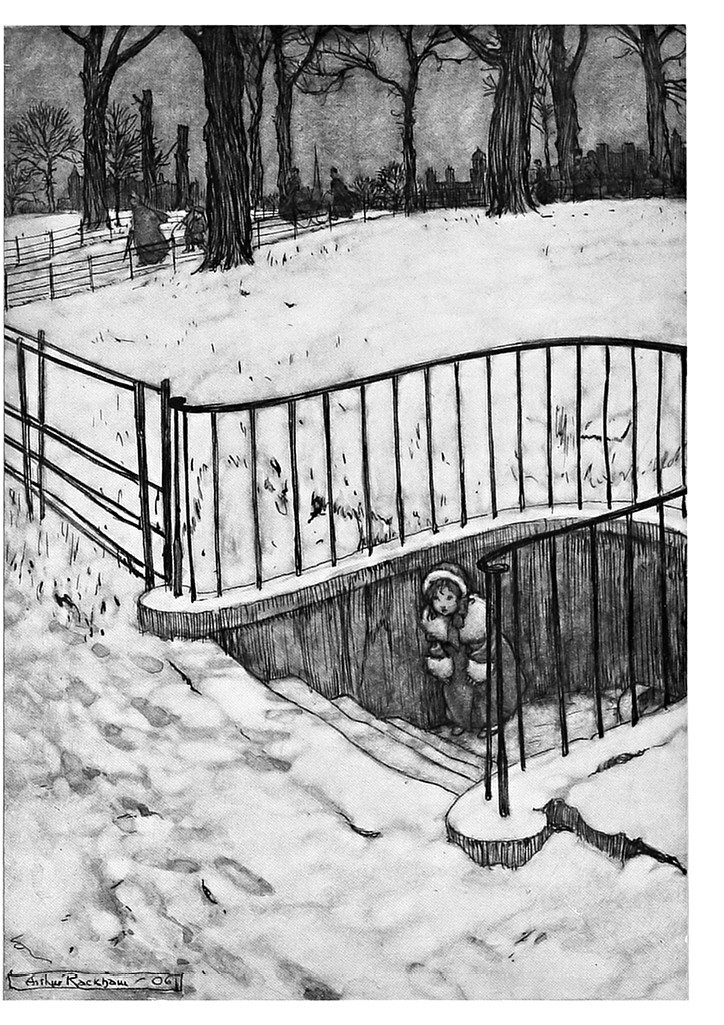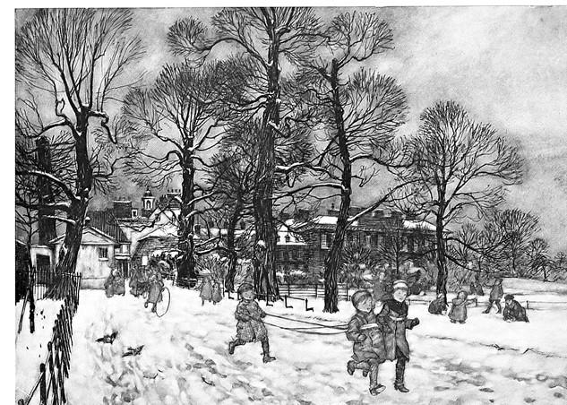 Так мы приближаемся к одному дню, когда сад покрылся снегом, а на Круглом Пруду появился первый лёд: ещё недостаточно крепкий, чтобы по нему можно было кататься, но, по крайней мере, его можно было пробивать камнями. Именно этим и занимались многие умные мальчики и девочки.