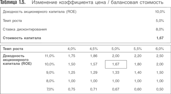 Чтобы лучше понять суть данного метода, нужно приравнять темп роста к нулю. В этом случае отношение стоимости к балансовой стоимости становится равным отношению доходности акционерного капитала к его стоимости. Если доходность акционерного капитала равна 8 % и ставка дисконтирования – 8 %, то стоимость компании всегда будет равна балансовой стоимости. Если доходность равна 10 %, а дисконт – 8 %, то при отсутствии роста коэффициент цена / балансовая стоимость будет равен 10/8 = 1,25. Теперь обратим внимание на взятую в рамку цифру стоимости в таблице при доходности собственного капитала 10 % и темпе роста 5 % – справедливая оценка коэффициента цена / балансовая стоимость равна 1,67. Это означает, что способность компании осуществлять дополнительные инвестиции, приводящие к 5 %-ному росту, создает дополнительную стоимость, этим обусловлена разница коэффициентов цена / балансовая стоимость (1,25 и 1,67).