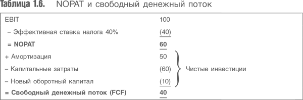 К этому расчету необходимо сделать два важных замечания. Первое: налоговая нагрузка – эффективная, и свободные денежные потоки рассчитываются с учетом предположения, что компания полностью финансируется за счет акционерного капитала. Денежные потоки рассчитываются без учета заимствований. Второе: итог по трем статьям (амортизация, капитальные затраты и изменение оборотного капитала) в совокупности составляют чистые инвестиции компании. Эта часть NOPAT, которая реинвестируется в бизнес, а свободный денежный доход – то, что выводится из него. Для действительно не имеющей заимствований компании NOPAT равна чистому доходу, а свободный денежный поток – сумме дивидендов, что мы и предполагали в нашем упрощенном обсуждении.
