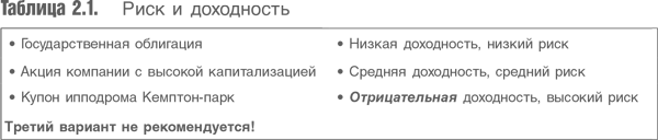 В табл. 2.1 приведены характеристики риска и доходности трех активов: государственной облигации, акции крупной компании и купона, удостоверяющего ставку на ипподроме. Нетрудно понять, что эти активы расположены по возрастанию степени риска. Возможно, менее ясно, что доходность третьего актива не положительная, а отрицательная.