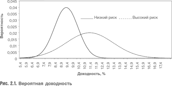 Итак, доходностью называется средняя ожидаемая доходность актива. Как можно количественно определить степень риска актива? Обычно принято определять ее как дисперсию возможных результатов. Степень риска инвестиций низкая, если результат известен или известно, что возможные результаты находятся в относительно узком диапазоне. Если множество результатов характеризуется большой неопределенностью, то степень риска инвестиций высокая. Распределение вероятностей для этих случаев показано на рис. 2.1.