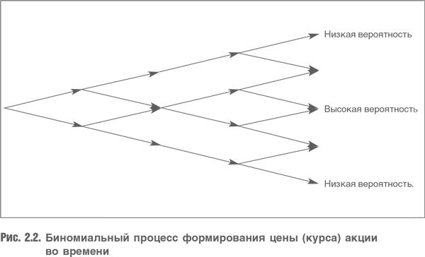 Предположение, что ожидаемая доходность имеет нормальное распределение, правомерно для активов, доходность которых складывается из малых положительных или отрицательных случайных приращений в течение продолжительной последовательности периодов, в каждом из которых вероятность выигрыша или проигрыша составляет 50 %. Такая модель достаточно хорошо описывает, что происходит с ценами акций. Обычно они периодически незначительно то растут, то снижаются согласно так называемому процессу случайного блуждания. Так постепенно складывается годовой доход. Эта особенность поведения во времени показана на рис. 2.2, где уровни подъемов и падений цен зависят от волатильности акции (измеряемой стандартным отклонением). При этом вероятность возможных результатов больше в центре распределения и ниже в его крайних точках. Когда число периодов стремится к бесконечности, результирующее распределение все больше приближается к нормальному.