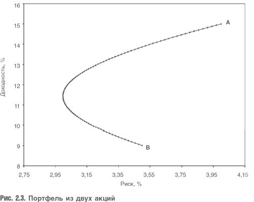 На рис. 2.3 показаны портфели, которые можно сформировать путем инвестирования в два актива со следующими характеристиками: А – ожидаемая доходность 15 %, стандартное отклонение 4 %, Б – ожидаемая доходность 9 %, стандартное отклонение 3,5 %. Если бы корреляция между ожидаемыми доходностями А и Б была абсолютной, то область доступных портфелей описывалась бы прямой линией, соединяющей точки А и Б.
