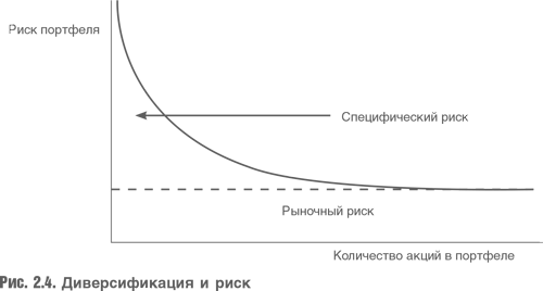 Отправная точка модели САРМ: при увеличении количества разных акций в портфеле его волатильность уменьшается, пока не достигает неснижаемого минимума – волатильности портфеля акций фондового рынка в целом. На рис. 2.4 показано, как изменяется волатильность портфеля акций при увеличении количества разных акций в нем. По мере того, как специфические для каждой отдельной акции риски диверсифицируются, единственным недиверсифицируемым риском портфеля остается так называемый рыночный или систематический риск.