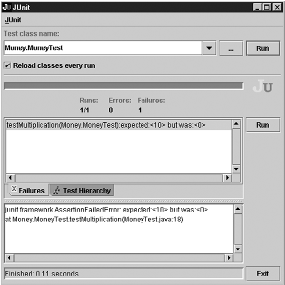 Загорается зловещий красный индикатор. Фреймворк тестирования (JUnit в нашем случае) выполнил небольшой фрагмент кода, с которого мы начали, и выяснил, что вместо ожидаемого результата «10» получился «0». Ужасно…