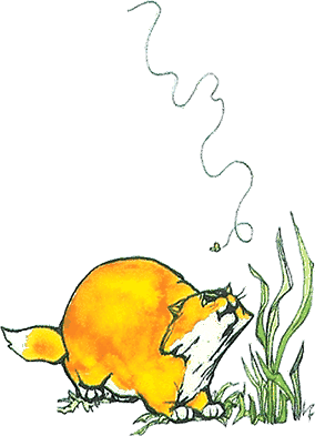 И они помчались вверх по склону, как две желтые молнии. Услышав человеческие голоса, Бакстер, апельсиновый кот, сел, навострил уши и принялся умываться. Тут ему на нос шлепнулась огромная дождевая капля. Он сразу забыл про охоту и устремился к крыльцу убыстряющейся рысью кота, твердо решившего остаться сухим. Увы! Небо распорола молния, и хлынул ливень. Бакстер взмыл на ближайший подоконник, распушил шерсть и сел, сердито косясь на капли, сыплющиеся с карниза ему на хвост. Но разобрав, что это за желтые фигуры приближаются к дому, мяукнул и спрыгнул на землю для последнего отчаянного рывка: он привык встречать близнецов на крыльце.