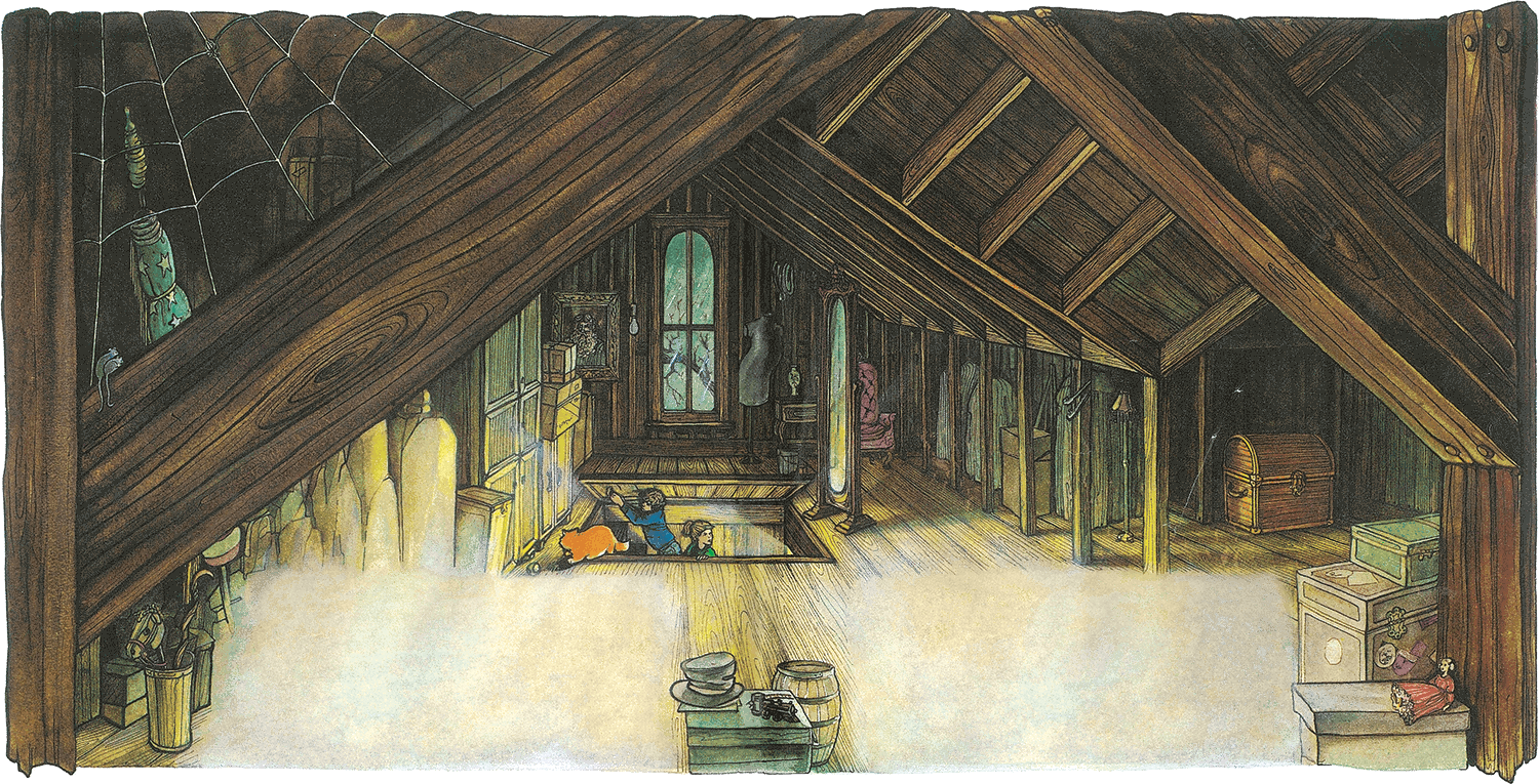 Полные приятных предвкушений, они поднялись по крутой чердачной лестнице и откинули крышку люка. Юркнув между ними, Бакстер оказался на чердаке первым. Сквозь узкие окна сочился тусклый зеленовато-серый свет, и все вокруг окутывал бархатистый сумрак, скрадывая краски, сгущаясь в сизую мглу у стропил. По крыше барабанил дождь. Небо пронзила молния, узкая, как палец скелета, на мгновение озарив мокрую голую ветку, которая скребла по стеклу.