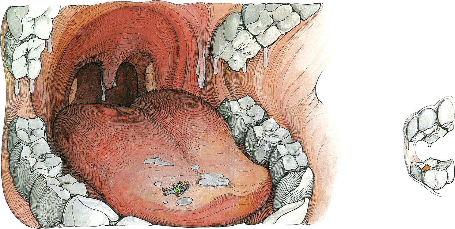 Они добрались до Бакстера и стащили его вниз как раз вовремя: верхние и нижние зубы сомкнулись с чудовищным стуком и началось землетрясение. Язык приподнялся, изогнулся, и они соскользнули в глубину рта. Там их бросило через водопад, как они ни цеплялись за скользкие стены. Язык величественно замер, потом его изогнутый конец начал опускаться к нижним зубам, но детей и кота уже несло в противоположную сторону.