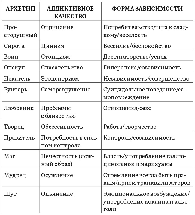 Тяготение к определенным поведенческим шаблонам зависит от доминирующего архетипа, и каждый из них может нас ограничивать. Выше перечислены аддиктивные модели поведения и установки, вызванные влиянием архетипов. Чем меньше позитивных проявлений архетипов в жизни, тем выше риск возникновения аддикции.