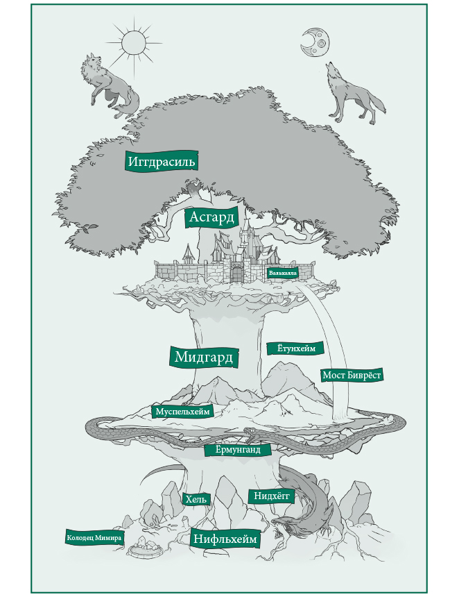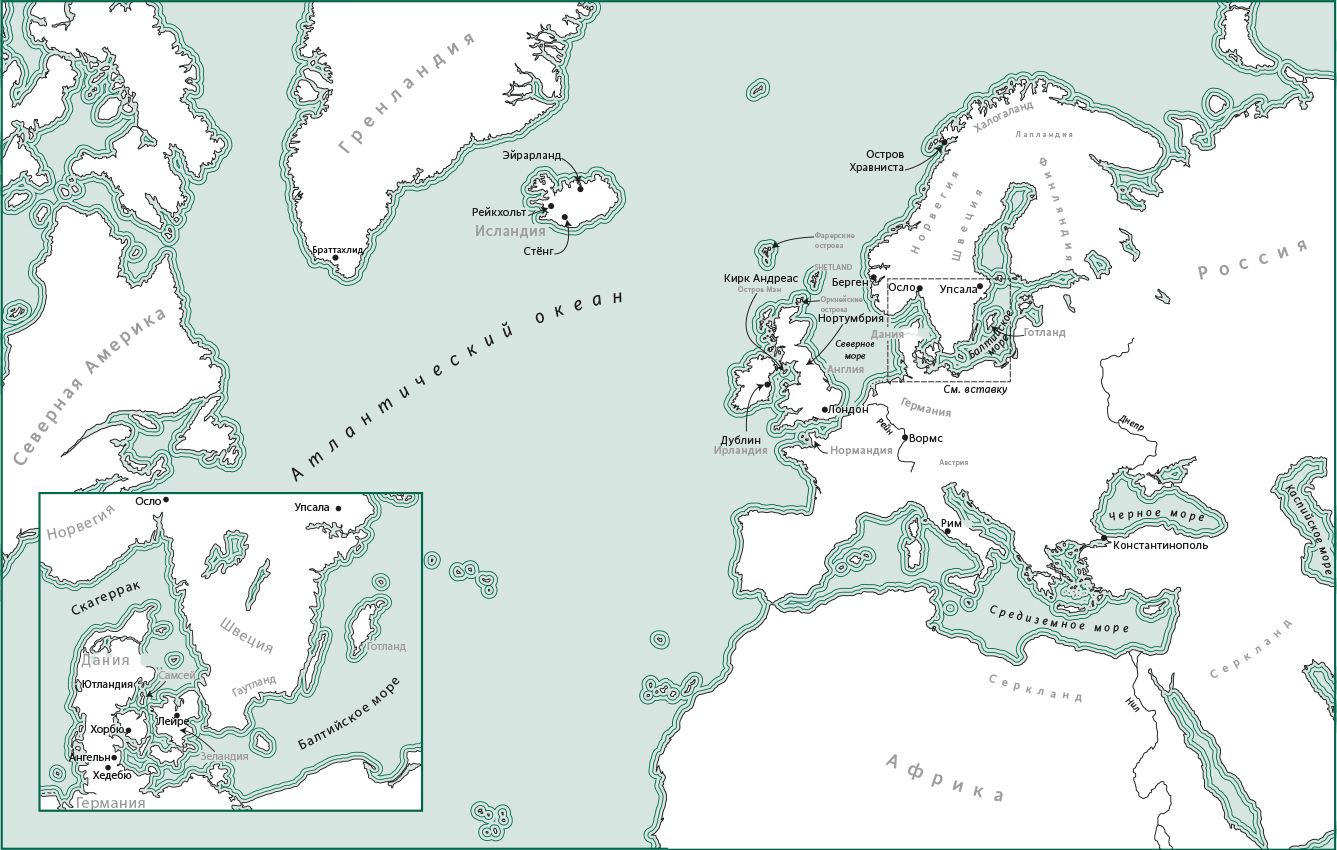 Как мы увидим в главе 2, в древнескандинавской мифологии есть несколько объяснений происхождения каждого мира, и споры о «подлинном» и «оригинальном» варианте не дадут ничего. Так же и версии египетских мифов разнятся на всем протяжении Нила. Древнескандинавские предания были культурной собственностью потомков викингов, расселившихся по северным землям. В так называемой диаспоре викингов народы, говорившие на скандинавских языках, проживали в Скандинавии, Британии, Нормандии и на островах Северной Атлантики, прежде всего в Исландии, а также на Фарерском, Оркнейском и Шетландском архипелагах. Позже они колонизировали южную Гренландию и основали поселения в Северной Америке. Скандинавы продвигались по Днепру до Черного моря и служили в варяжской страже императоров в Константинополе; они даже стали основателями русских княжеств.