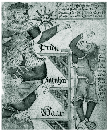 Король Гюльви встречает Высокого, Равновысокого и Третьего. Миниатюра исландской рукописи XVIII века