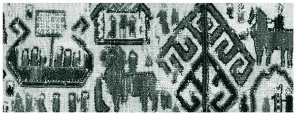Всадники, корабли и стилизованные изображения деревьев на гобелене эпохи викингов из Оверхогдаля, Швеция