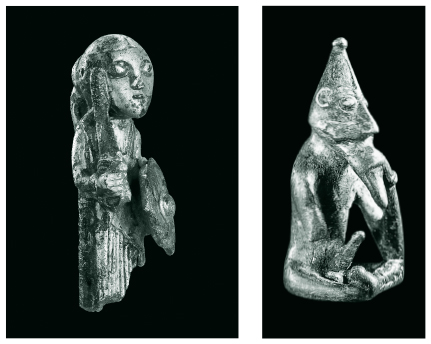 Слева: женская фигура с мечом и щитом, вероятно валькирия, недавно найденная в ходе раскопок в Хорбю (ок. 800). Справа: маленькая металлическая фигура, предположительно изображающая Фрейра, из Рэллинге