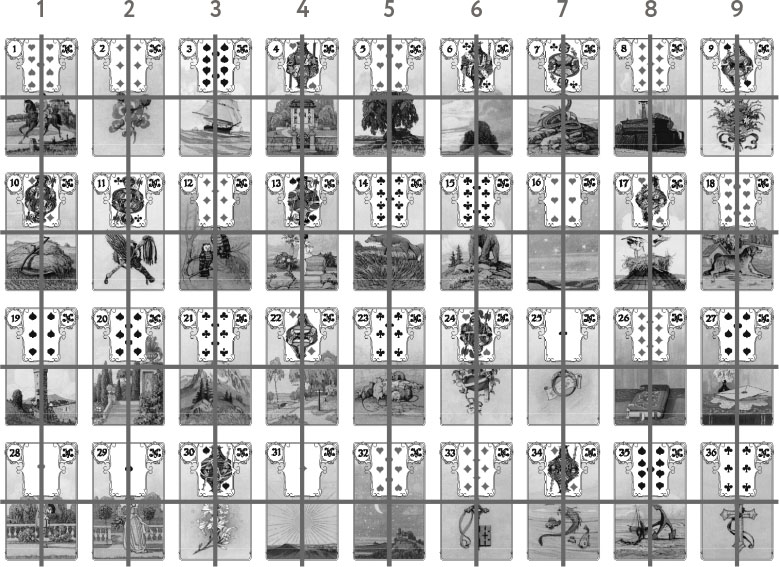 Для более наглядного понимания этого принципа колода Ленорман раскладывается в четыре ряда по девять карт в каждом, в соответствии с их порядковым номером: на первом месте Всадник с цифрой 1, на втором – Клевер с цифрой 2, Корабль с цифрой 3 на третьем и так далее, до последнего места, где лежит Крест с цифрой 36.