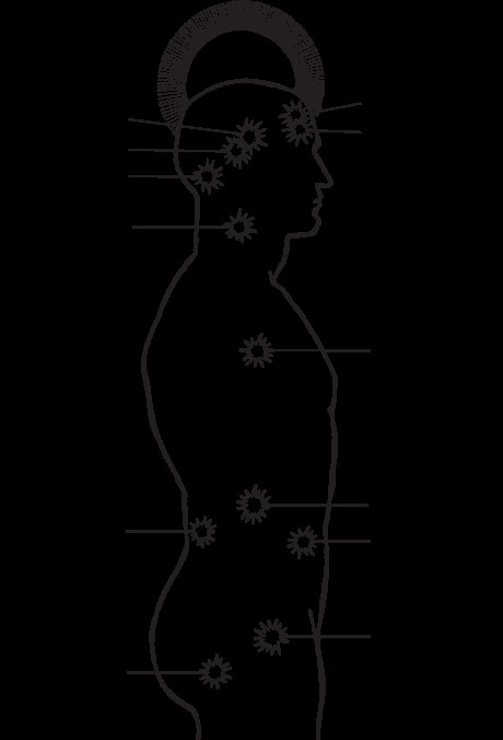 Где находятся эти силы и что они собой представляютВековые секреты исцеления говорят, что у каждого из нас есть 12 сил сознания и расположены они в нашем теле в следующих жизненно важных нервных центрах и железах. Как показано на рис. 1.