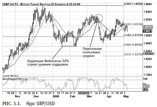 Из графика курса GBP/USD (рис. 1.1) видно, что коррекции, скользящие средние и стохастический осциллятор довольно точно предсказали поведение рынка в будущем. Например, коррекция 50 % служит уровнем поддержки для пары GBP/USD в январе и феврале 2005 г. Помимо этого, пересечение простых скользящих средних за 10 и 20 дней точно предсказало сброс GBP/USD 21 марта 2005 г. Наиболее эффективно технический анализ могут использовать трейдеры фондового рынка, которые в сделках с ценными бумагами также опираются на графики и индикаторы. На Forex можно применять те же стратегии.