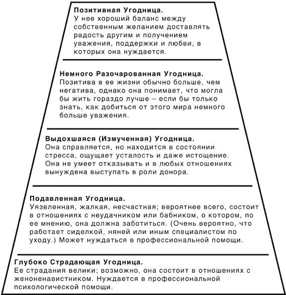 Надеюсь, что вы уже получили общее представление о том, кто такие угодницы, и выяснили, на какой ступеньке пирамиды угодниц находитесь вы. Не забывайте при этом, что никакой опрос не является непогрешимым и не может гарантировать абсолютную точность результатов. Многое зависит от вашего настроения в момент прохождения опроса; отвечая на вопросы анкеты в разные дни, вы можете набрать больше или меньше баллов.