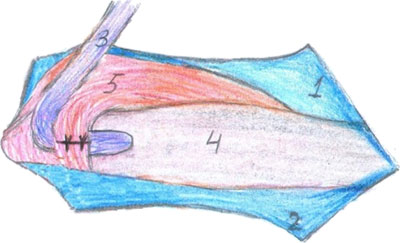 Рисунок 5. Схема завершения 1-го этапа операции. 1,2 – листки апоневроза; 3 – семенной канатик; 4 – поперечная фасция; 5 – мышцы