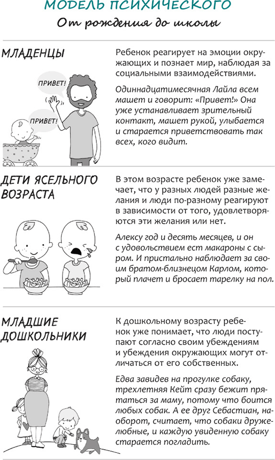 Итак, теперь, когда вы в целом представляете себе, что такое модель психического, как ее сформированность определяют психологи и каковы некоторые ее основные этапы, давайте подробнее рассмотрим, как эта модель развивается с младенчества и до препубертатного возраста. Понимание, как и когда у ребенка формируются представления о тех или иных аспектах модели психического, поможет вам иначе взглянуть на собственного ребенка и придаст уверенности в своих силах. Оценивая поведение ребенка с позиций психологии, вы сможете спокойнее реагировать на его поступки, создадите необходимую психологическую дистанцию между собой и малышом (что ни в коем случае не означает, что вы станете меньше его любить) и будете увереннее в своих методах воспитания.
