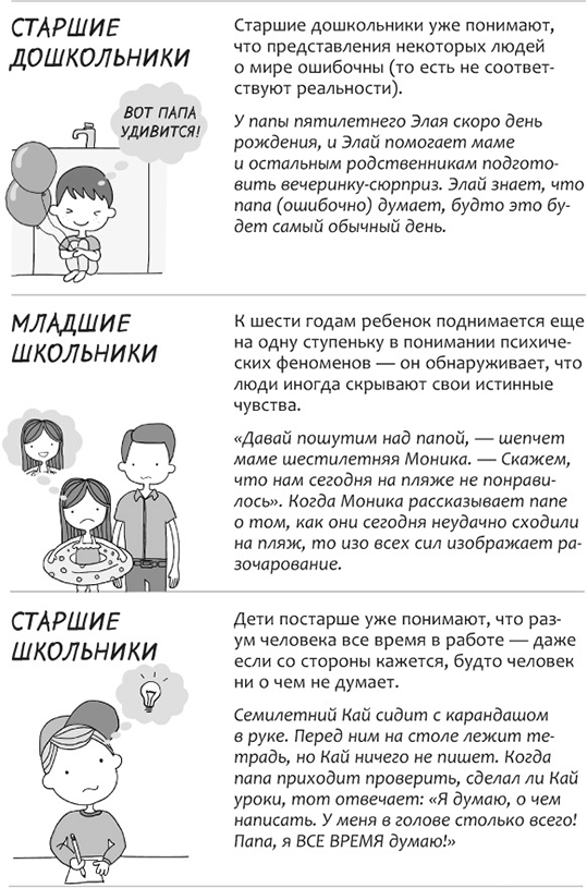Иными словами, модель психического у ребенка еще только формируется. И как вы уже, наверное, поняли, развитие способности осмысливать психические феномены – как у себя, так и у других – сложный и многоступенчатый процесс. Формирование модели психического тесно связано с развитием языковых и прочих навыков, в том числе памяти, гибкости мышления и способности к самоконтролю (известных также как исполнительные функции, о чем мы подробнее поговорим в главе 3).