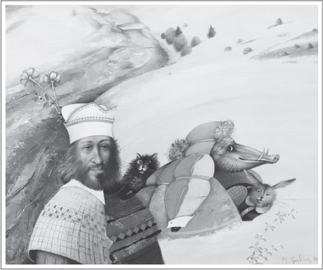 На парозе стаялі незнаёмыя Уладзе істоты. Спадар быў зялёнага колеру, на носе-дудцы мацаваліся акуляры, шэра-серабрыстая прычоска сілуэтам аддалена нагадвала грэбень-чубок. Госць абапіраўся на кульбачку. Пад руку яго трымала жоўтая спадарыня, таксама ў акулярах і з высокай прычоскай у некалькі ярусаў, якая па форме і колеры была падобная да шакаладнага кекса.