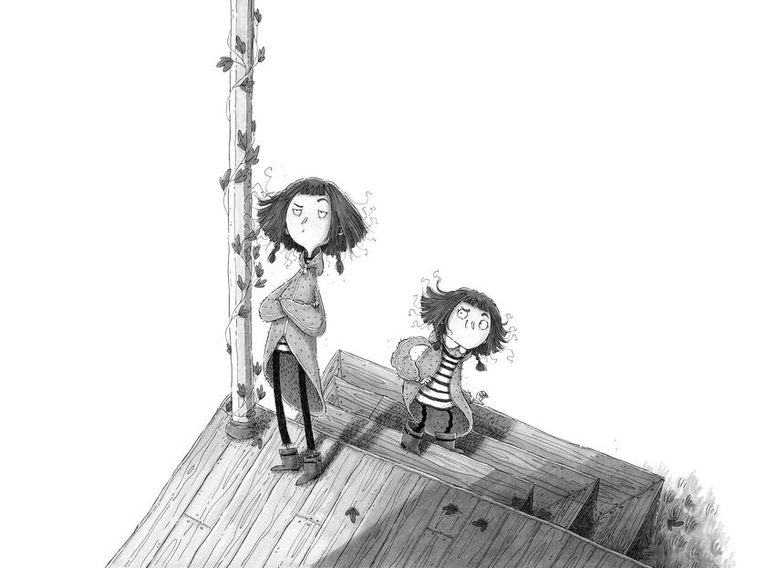 Только теперь мисс Корица заметила, что девочек на самом деле было две. Та, что поменьше, была копией той, что побольше. «Видимо, в копировальной машине в самый ответственный момент закончилась краска, – подумала мисс Корица, – или кто-то споткнулся и случайно задел кнопку масштаба, поэтому вторая девочка получилась меньше». Но в той машине было достаточно рыжих чернил для того, чтобы покрыть копию такими же дьявольскими веснушками. Фиолетовый сапог крупной версии был сделан надёжно и крепко застрял между дверью и дверным косяком.
