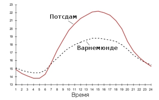 Рис. 1. Ход среднесуточной температуры в июле в Варнемюнде (на побережье Балтийского моря) и в Потсдаме