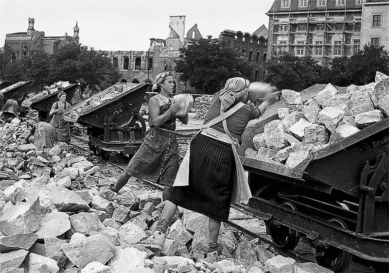 Подобные картины врезались в память, потому что эти цепи женщин, передающих друг другу ведра с камнями, стали великолепной метафорой коллективизма, который был так необходим населению погибшей страны. Какой контраст! Груды развалин с одной стороны – и сплоченность борющихся с ними людей с другой! Восстановление городов на этих фото приобрело героически-эротический характер – с этими образами было легко отождествлять себя, и этим трудом можно было гордиться, несмотря на поражение. Женщина в фартуке и в грубых рабочих сапогах на грудах развалин – иконографический антипод «фройляйн», американской «подстилки» – другого стереотипа, который столь же крепко засел в коллективной памяти.