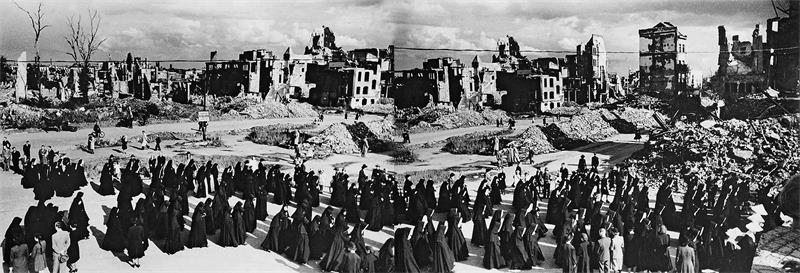 Конкурент Петера на Западе, кёльнский фотограф Герман Клаазен, был тоже не прочь усилить эмоциональное воздействие образов разрушения с помощью художественных приемов. В конце мая 1945 года он сфотографировал первую торжественную процессию в Праздник Тела Христова после войны. Невероятное зрелище – мимо разрушенных домов, силуэты руин которых врезались в серое небо, по истерзанной земле, по камням, превращенным в труху, тянется длинная процессия одетых в черное людей, словно некое призрачное шествие кающихся грешников, словно колонна отверженных перед стенами опустевшего, умершего города. Чтобы усилить драматизм сюжета, Клаазен прибегает к простому трюку. Для своего фотоальбома «Песнь в пещи огненной», впервые опубликованного в 1947 году, он удлинил панораму этой многофигурной композиции, скопировав среднюю часть снимка и смонтировав ее дважды. Таким образом он как бы расширил границы кёльнской трагедии. Чтобы заметить этот обман зрения, нужно внимательно всмотреться в снимок.