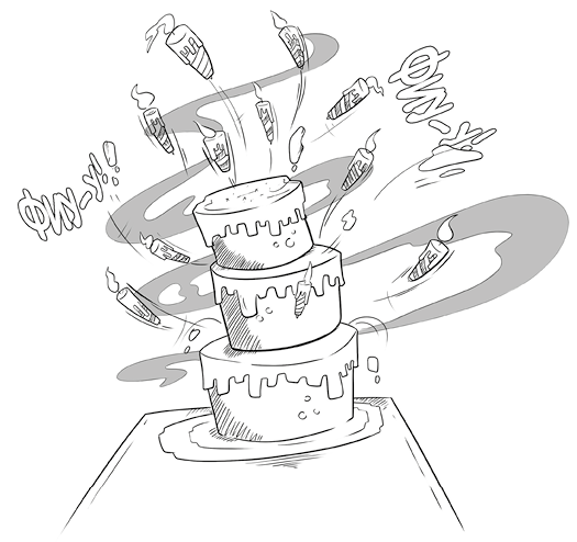 Оставшиеся две свечи устроили настоящую гонку за гостями именинника. Друзья Дубиэля бегали по всей столовой, пытаясь убежать от них, но укрыться в шкафу не успели – со звуком «ПИМБА!» те хорошенько ударили их по затылкам.