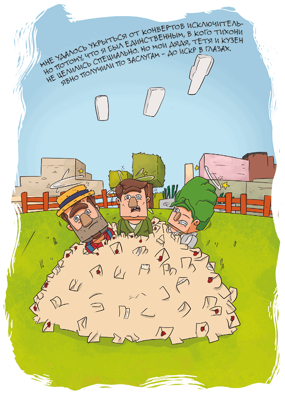 Мне удалось укрыться от конвертов исключительно потому, что я был единственным, в кого тихони не целились специально. Но мои дядя, тетя и кузен явно получили по заслугам – до искр в глазах.