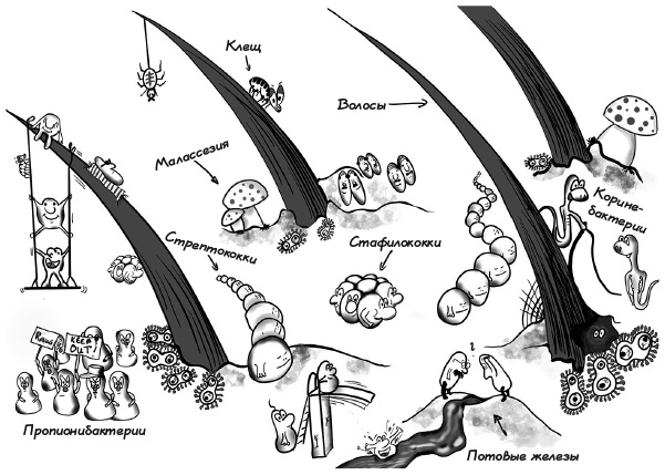 Между прочим, под волосами в меньшей степени подразумевается роскошная прическа на голове и в большей – эдакое пальто, более или менее плотно покрывающее все тело. Для садящихся на тело различных возбудителей болезней волосинки – своего рода гигантские деревья, задерживающие самую крупную грязь. Ресницы – густые, непроходимые леса, а ногтевые пластины, как и мозоли, подобны непроницаемым каменным плитам. Вместе с реками из пота, слюны и прочего секрета, омывающими кожу и оказывающими лечебный или защитный эффект, и бактериями это поистине негостеприимная, непригодная для жизни местность.
