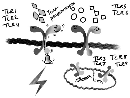 Со временем открывали всё новые рецепторы этой разновидности. У человека таких известно 10, в животном мире – 14. Все они могут вычленять определенное чуждое данному организму свойство: толл-подобный рецептор 2 (TLR 2), например, распознает вещество зимозан и поэтому точно знает, когда в организм хочет проскользнуть грибок; толл-подобный рецептор 5 (TLR 5) идентифицирует белок флагеллин, который образует своего рода плавник определенного вида бактерий; а толл-подобный рецептор 7 (TLR 7), среди прочего, специализируется на однотяжевой РНК, характерной для вирусов. Последний рецептор совместно с некоторыми другими локализуется внутри клетки, чтобы сразу указать на возможную вирусную инфекцию. Наряду с толл-подобными рецепторами существует еще куча других, которые своеобразным способом запускают врожденную иммунную систему. Работа рецепторов сравнима с деятельностью дерматолога, который на первый же взгляд может отличить раковую опухоль на коже от фурункула.