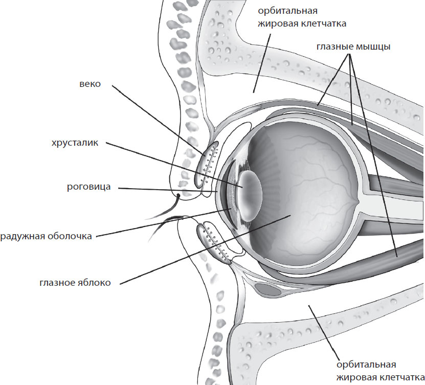 Рисунок 1.1. Элементы глазного яблока, расположенные за веками (вид сбоку)