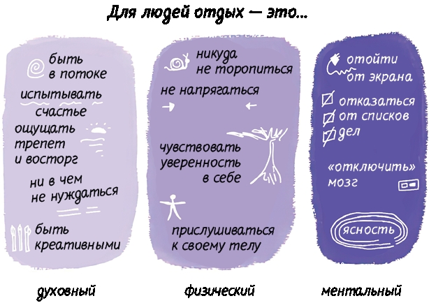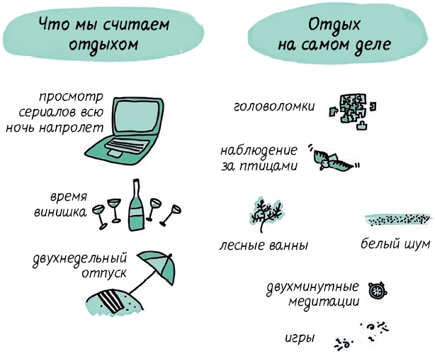 Люди говорили мне «сбавь обороты», «успокойся», «расслабься», «меньше напрягайся», но никто из них так и не смог внятно объяснить, как именно это сделать. Предполагалось, что отдых подразумевает под собой отсутствие работы (или, возможно, каких-либо других дел). Однако, учитывая мой весьма неоднозначный опыт «творческого отпуска», это совершенно разные вещи. Все, кого я знала, были прекрасно осведомлены о том, что такое трудолюбие и как быть ценным сотрудником. Но ни один человек не дал четкого представления о правильном подходе к отдыху и восстановлению внутренних ресурсов.
