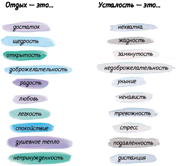 За несколько минут составьте список того, что дает вам ощущение отдыха и подзарядки: виды деятельности, события, атмосфера, даже люди. Желательно, чтобы получилось от пяти до десяти пунктов.