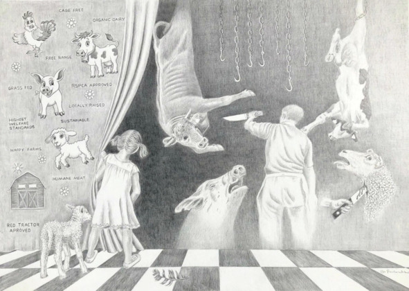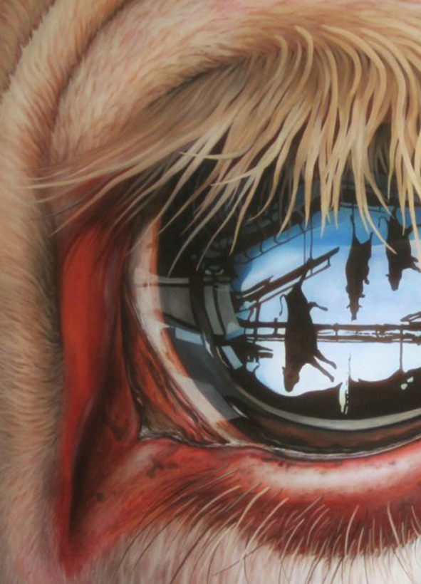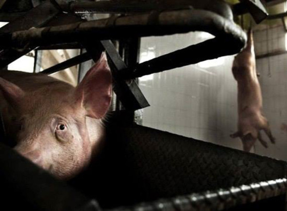 В эту минуту, по всему миру, животных везут в грузовиках на бойни, в здания, которые мы старательно построили, чтобы совершать систематические убийства! Они испуганы, они голодны, они давно не пили, у них нет ничего и никого кроме друг друга! В их широко открытых глазах застыл страх от предчувствия того, что будет дальше. Когда грузовики приезжают, их выталкивают оттуда и они идут на собственную смерть! Миллиарды животных стоят в очереди на убой и они жутко испуганны, воздух наполнен запахом крови, смердит, они чувствуют это и они не хотят умирать! Живые, чувствующие существа входят туда, умерщвляются человеком и разрезаются на сотни кусков, чтобы мы ели их трупы.