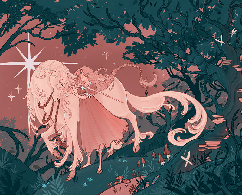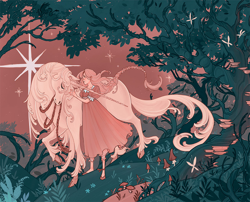 Перепуганный единорог, угодивший ногой в охотничий капкан, истекал кровью. Зверь был огромный и совсем дикий. Девочка никогда раньше не видела единорогов, но сразу поняла, что животное это непростое. Поняла она и то, что, как только охотник вернется проверить капкан, единорога будет уже не спасти. Поборов страх, девочка подкралась к нему, ступая так осторожно, как только могла. Чтобы успокоить зверя, она дала ему немного собранных грибов. Почувствовав, что может приблизиться, девочка наклонилась и высвободила ногу животного.