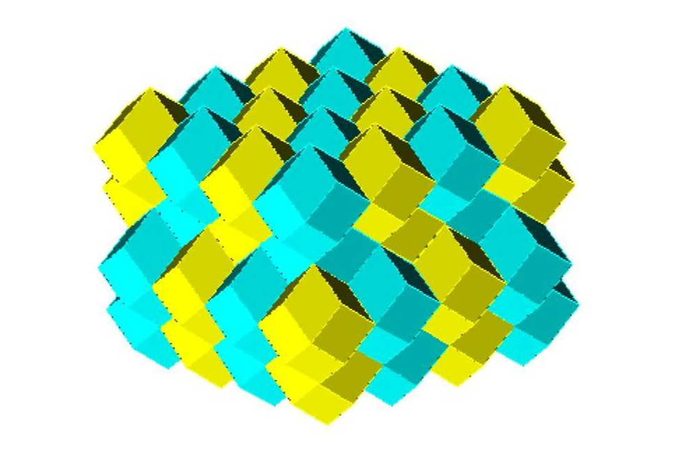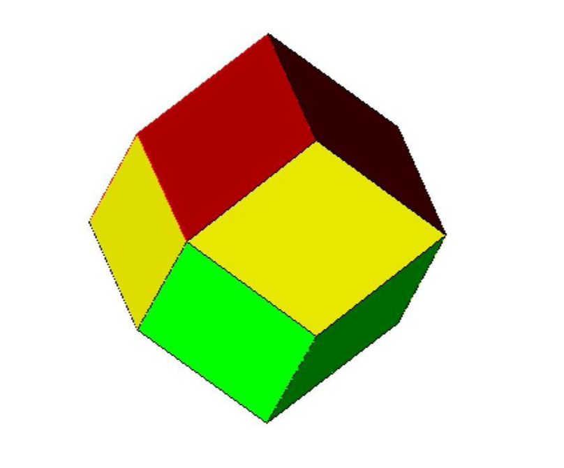 Если воздействовать со всех сторон одинаковым внешним давлением на такое образование, но из пластичных шаров, то благодаря их пластичности, пустоты исчезнут, а шары приобретут форму двенадцатигранника с равными гранями в форме ромбов, то есть форму ромбододекаэдра, как показано на рисунке 3.