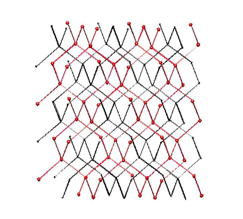 Очевидно, что в двух соседних слоях квантов пространства верхний слой южными зонами своих квантов контактирует с северными зонами квантов нижнего слоя. В этом случае неминуемо каждый квант одного слоя будет контактировать своими гранями с двумя однотипными квантами другого слоя, образуя две сети сообщающихся квантов пространства (см. рисунок 7).