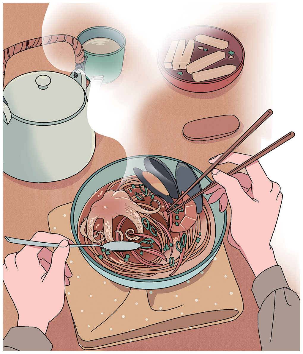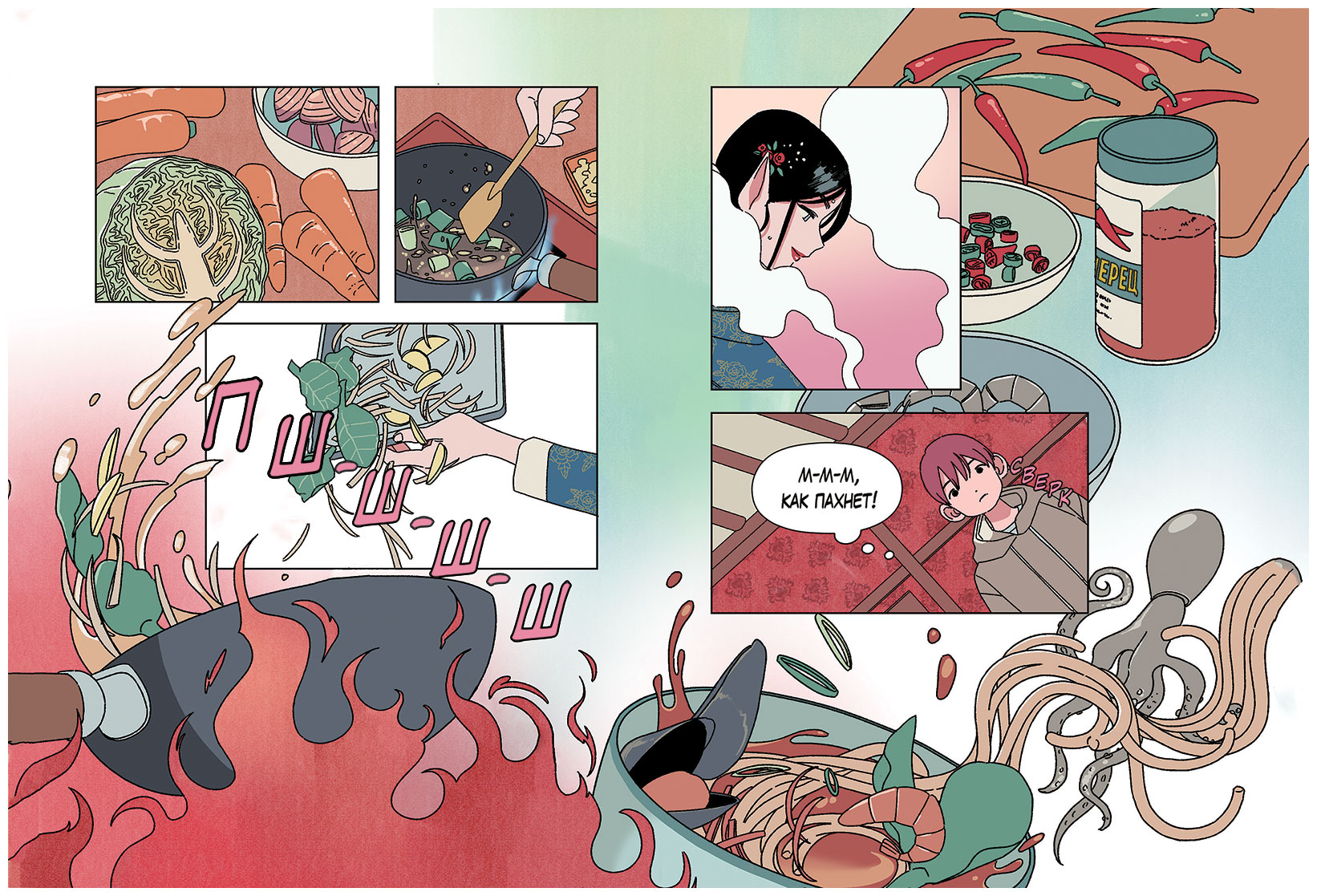 Тохваран добавила уже отваренную лапшу, подержала суп на огне ещё немного. Теперь и лапша танцевала. Чисок не мог отвести взгляд от сковороды. Ему не терпелось попробовать суп чжампон.