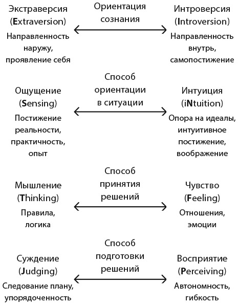 MBTI (Myers – Briggs Type Indicator) – известный опросник, предназначенный для психологического тестирования. Он основан на типологии личности, которую в 1940-х годах разработали Изабель Майерс и Кэтрин Бриггс[6], отталкиваясь от работ Карла Юнга. Опросник достаточно простой и понятный, а потому до сих пор очень популярный. Например, раньше было модно определять совместимость партнеров по группе крови, а сейчас некоторые используют для этого MBTI.