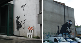 Back in the 1980s when graffiti was just crossing over into the New York downtown art scene, somewhere in Bristol, some kid called Robin was going to school and having fun. Years later, mirroring the past (just like the old-school New York graffiti ‘writers’), Banksy began his career as a graffiti writer and attempted to get up on every wall of the borough of Easton, where he was from. The Banksy juggernaut began rolling with his first ever exhibition, which was held in a block of council flats. He sold four canvases to the band Massive Attack. He then progressed to using stencils, as it was a lot quicker to apply and created a harder impact, something that has always been important for his work. A well hard impact! And the resulting attention to detail is one reason why Banksy is responsible for the popularity of street art right now. He is the undisputed leader of the movement and his work is by far the wittiest, most accessible of any artist of the last 50 years. This is because everyone gets it. He gets up somewhere and the resulting piece makes the front page of newspapers all over the world because the work is beautiful, topical, cheeky and extremely accessible.