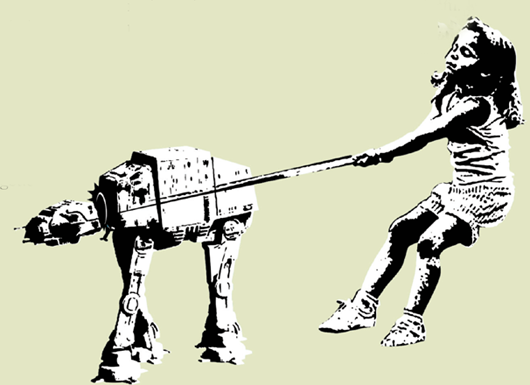‘When I first started I used to make small stencils of weird scratchy characters that filled my sketchbooks. From there I practised more and more and got my head around the stencilling process then along came my Shat-at piece which is what really drop-kicked me into the scene properly. From there I did a series of Star Wars themed pieces, a trilogy to go with the original films. These went down well and I was lucky enough to work with Pictures On Walls in making the images into screen prints and get them out to people who wanted them.’