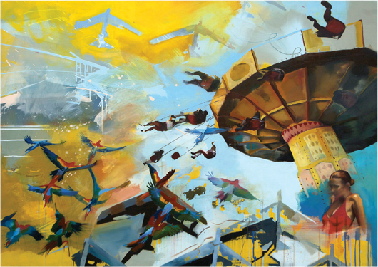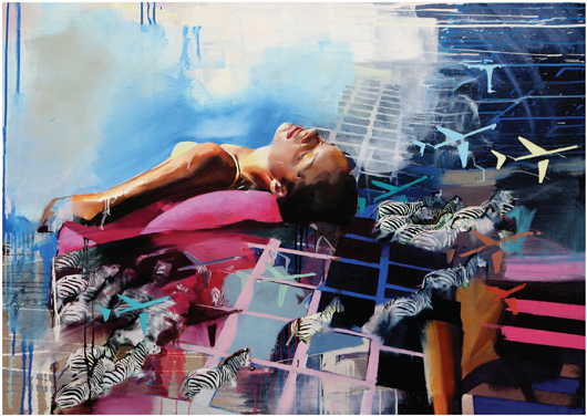 ‘I think a lot about colour, mark making, movement, composition, form; these are the bricks out of which a painting is built. For the viewer the first thing they often relate to is the imagery. Previously, landscape was my primary subject but my emphasis has now switched to the figure. Oil painting and the figure seem to belong to each other and I take a lot of pleasure in painting flesh. But mostly my paintings are about the combinations of imagery I use, unexpected pairings and trying to create a narrative and then drown it out again in paint. It’s a tug of war.